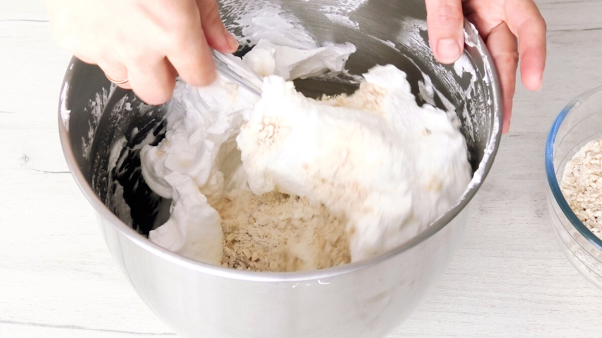 У два прийоми ввести в неї сухі інгредієнти, акуратно перемішуючи лопаткою знизу- вгору, буквально декількома рухами, щоб білки не осіли.