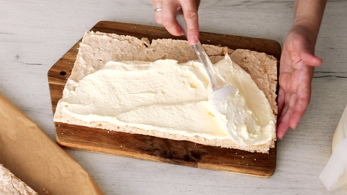 Викласти перший корж і добре змастити світлим кремом.