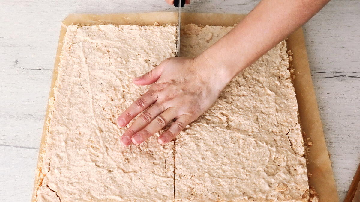 Готовий корж остудити на решітці, а потім підрівняти краї.