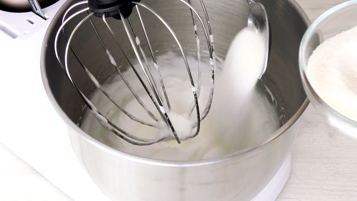 Далі продовжуючи збивання по ст. ложці додати весь цукор. Кожен раз добре і ретельно збиваючи поки весь цукор не розчиниться.