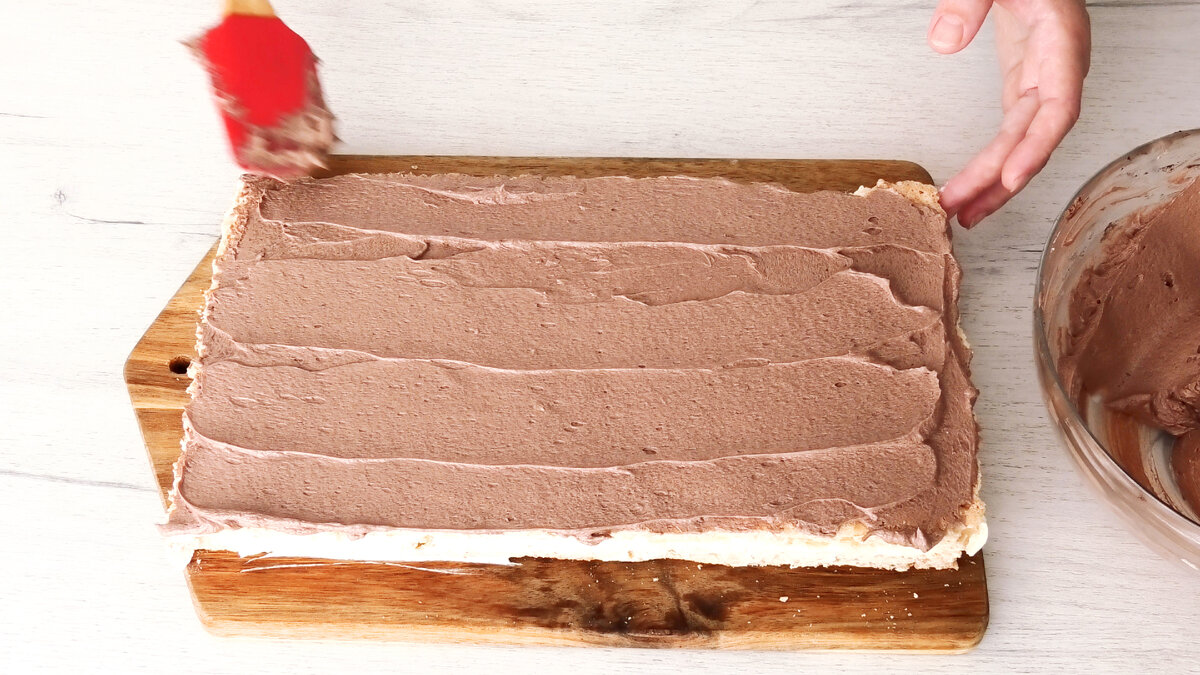 Укласти зверху другий корж і змастити вже шоколадним кремом і верх і боки торта. Крему не шкодуйте, його досить.