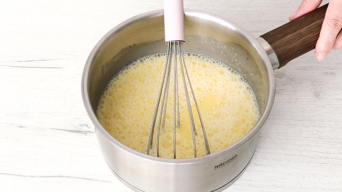 У сотейник налити молоко, додати цукор, ванільний цукор і жовтки. Ретельно перемішати вінчиком і поставити на вогонь.