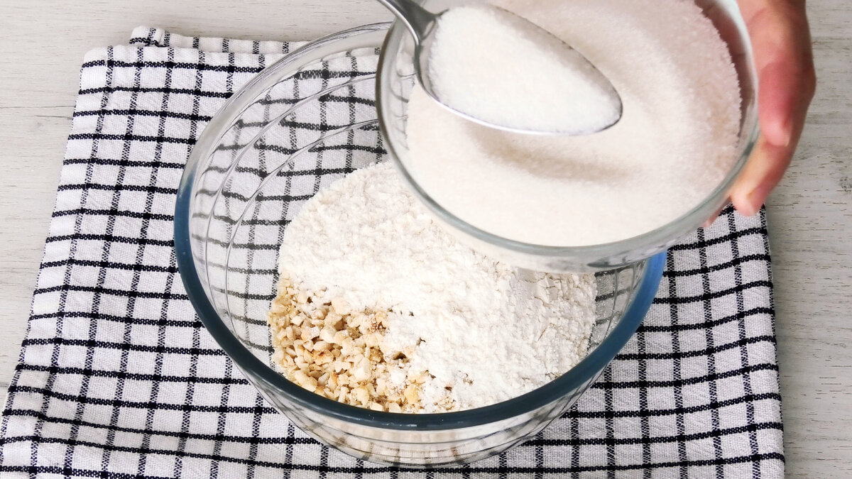 Окремо з’єднати перемелені горіхи, борошно і 2 столові ложки цукру від загальної кількості.