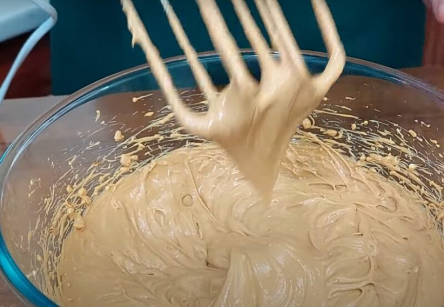 Виливаємо в тісто окріп, швидко перемішуємо. Тісто має вийти як рідка сметана.