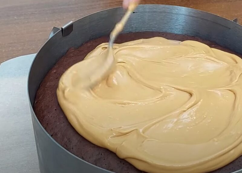 Ділимо крем візуально на 3 частини, змащуємо ним кожен корж, який кладемо у кільце.