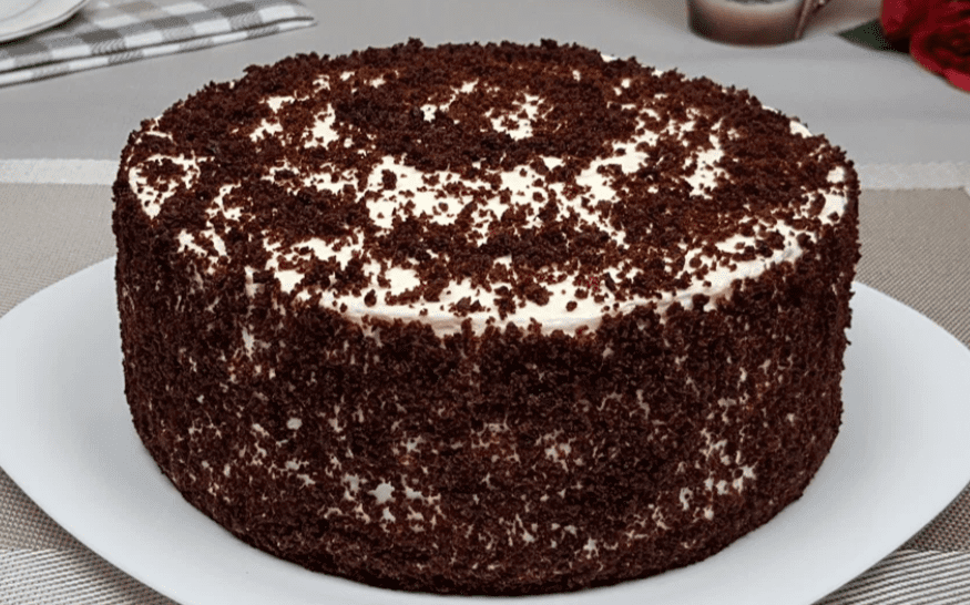 - Раніше обрізану верхівку подрібнюємо в крихту та обсипаємо крихтою весь торт.
