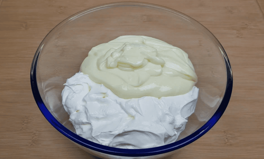 - Додаємо до сметани згущене молоко і 4 ч. ложки ванільного цукру. Ванільний цукор можна додавати за смаком.