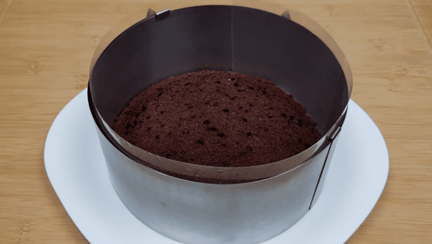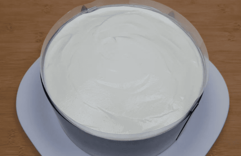 - Формуємо торт. Викладаємо перший корж на тарілку, встановлюємо кільце і ацетатну плівку. Ділимо візуально крем на 3 частини та викладаємо на корж 1/3 частину крему. Крем рівномірно розрівнюємо.