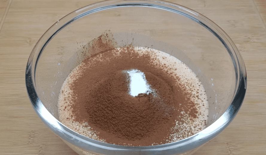 - Просіюючи додаємо – 1 склянка пшеничного борошна, 3 ст. ложки без верху какао, 1 ч. ложку соди.