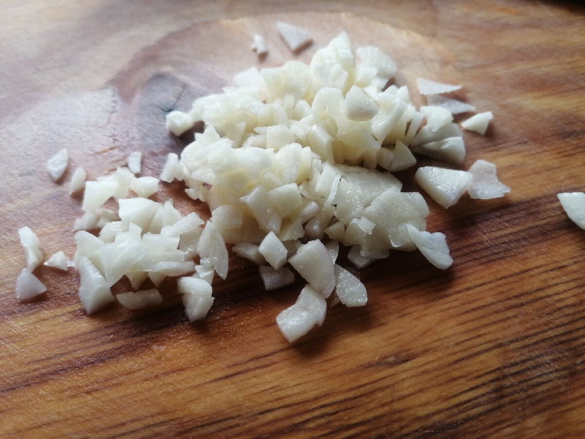 Зубчики часнику очистити і нарізати. Як показав досвід, з нарізаним смачніше, ніж з подрібненим на терці або в пресі.