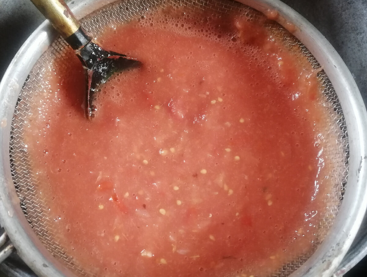 Треба взяти сито, дерев’яну ложку і отриману масу через сито протерти. Можна без цього кроку, але насіння і шматочки шкірки соус не прикрасять.