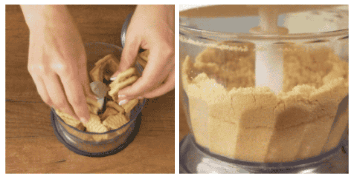 300 г пісочного печива ламаємо та кладемо у подрібнювач. Все подрібнюємо до дрібної крихти. Оскільки подрібнювач у мене невеликий, то я подрібнювала крихту за два підходи.