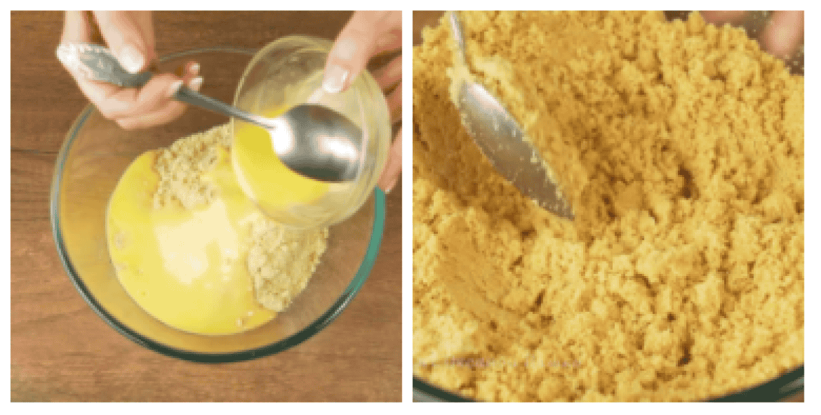 2. Приготовлену крихту висипаємо у миску. Сюди ж наливаємо 130 г розтопленого вершкового масла. Все перемішуємо до однорідності.