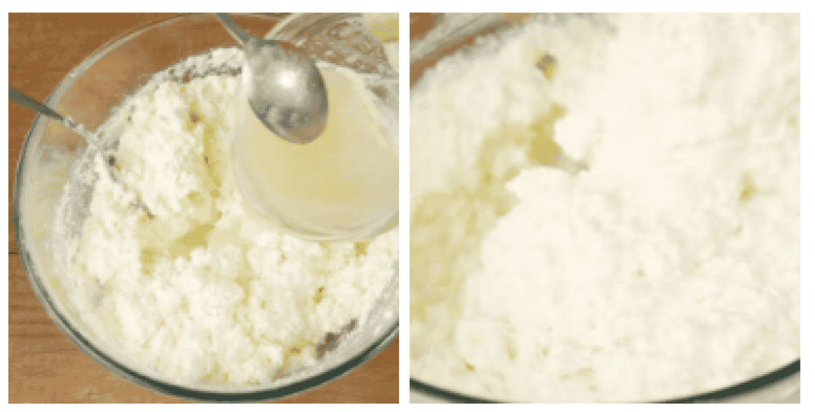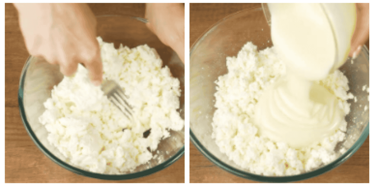 5. У велику миску насипаємо 800 г сиру. Сир можна використовувати будь-якої жирності. Вилкою розминаємо сир, щоб подрібнити великі шматочки, що склеїлися. За бажанням сир можна подрібнити занурювальним блендером. Сир бажано дістати з холодильника за 10-15 хвилин до приготування, щоб він трохи зігрівся. Тоді при введенні желатину не утворюватимуться желатинові грудочки.