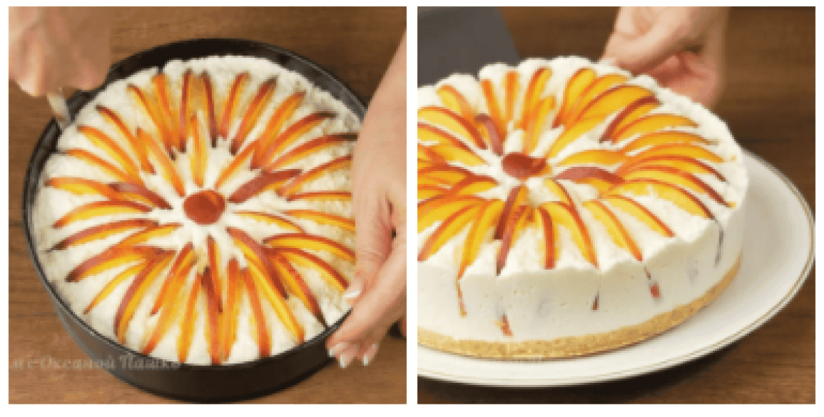 10. Відразу, поки торт ще не застиг, пластинки нектаринів вставляємо в торт. У центр кладемо кружечок з нектарину, а навколо нього вставляємо пластинки шкіркою нагору. Вдавлюємо їх у сирну масу. Так прикрашаємо весь торт.