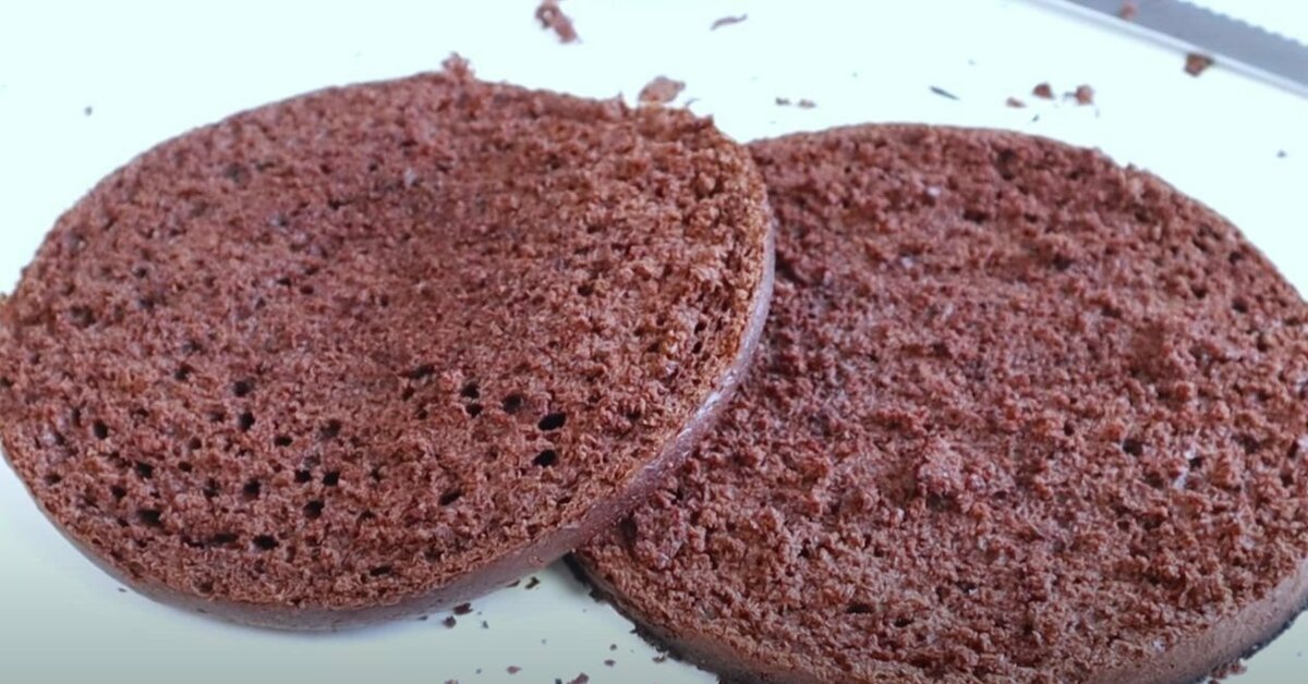 Зрізаємо з бісквіта верхівку і розрізаємо корж на 2 частини.