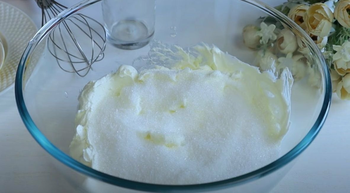 Для крему збиваємо густу сметану з цукром. Відмінно також підійде будь-який інший крем, наприклад заварний або на основі згущеного молока.