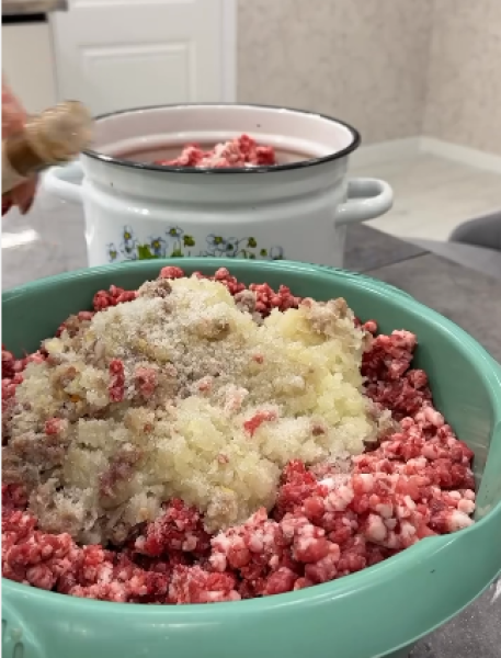 Перекручуємо м’ясо на великій м’ясорубці або дрібними шматочками ріжемо – так смачніше буде. Додаємо перекручену цибулю, (можна без цибулі), часник, спеції та воду. Фарш повинен бути трохи не дуже крутим!