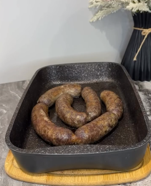 Готові ковбаси можна трохи відварити, а потім обсмажити в духовці, можна відразу смажити.