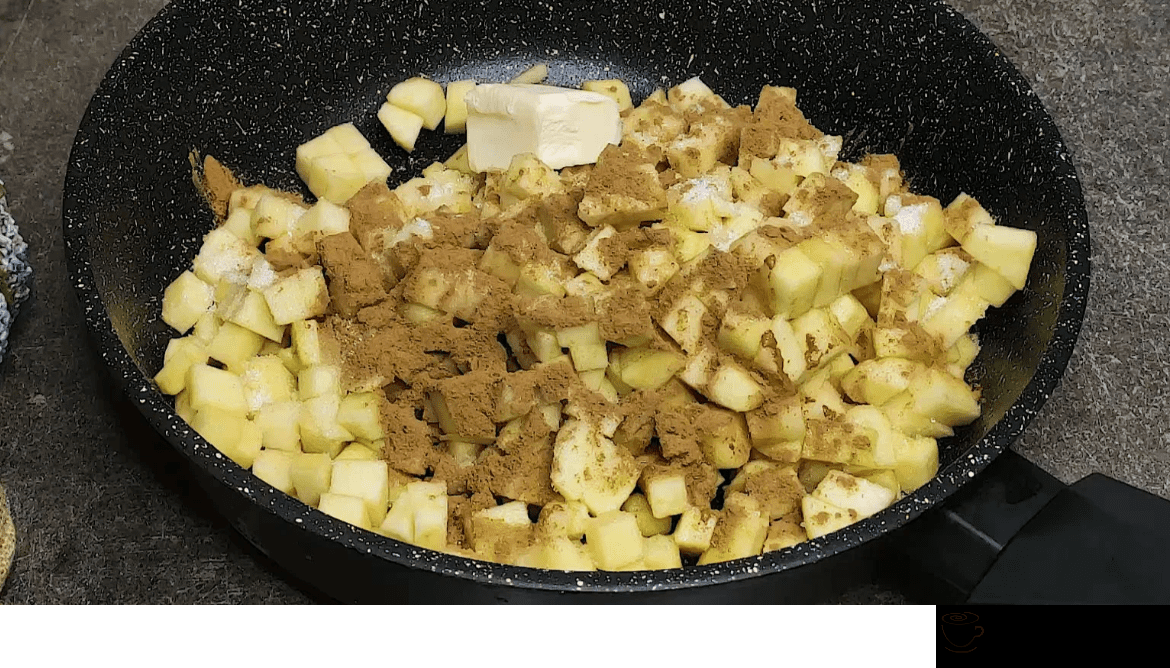 - Яблука очищаємо від шкірки, забираємо серцевну і нарізаємо невеликими кубиками. Висипаємо яблука на сковорідку, всипаємо цукор, корицю, вливаємо сік лимонний і додаємо вершкове масло.
