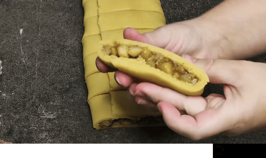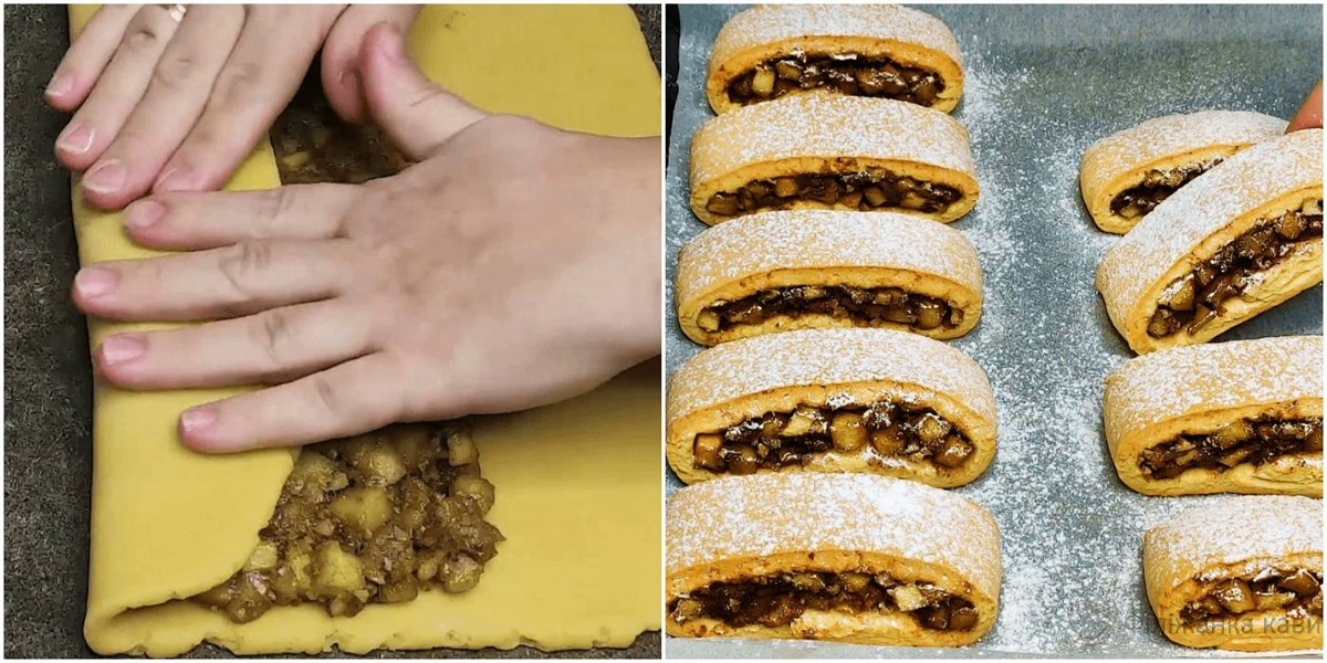 - Стіл присипаємо борошном, викладаємо тісто і розкачуємо в прямокутний пласт. У центр викладаємо підготовлену яблучну начинку та завертаємо краї до центру.
