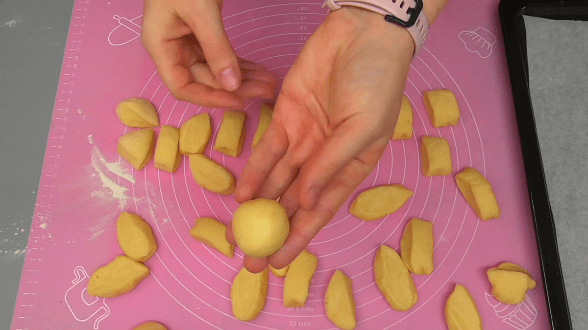 Кожен шматочок тепер скачуємо в кульку і кладемо на деко.