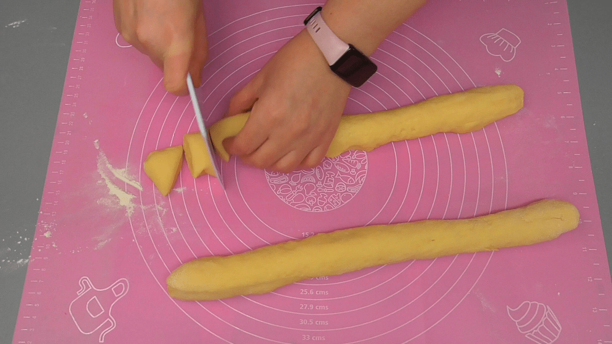 Тісто витримувати не потрібно, тому відразу приступаємо до формування печива. Для зручності я ділю тісто на 2 частини і скачую в ковбаски. Кожну ковбаску ріжу на невеликі шматочки. Розмір печива можете регулювати на свій розсуд, зробити їх поменше або побільше.