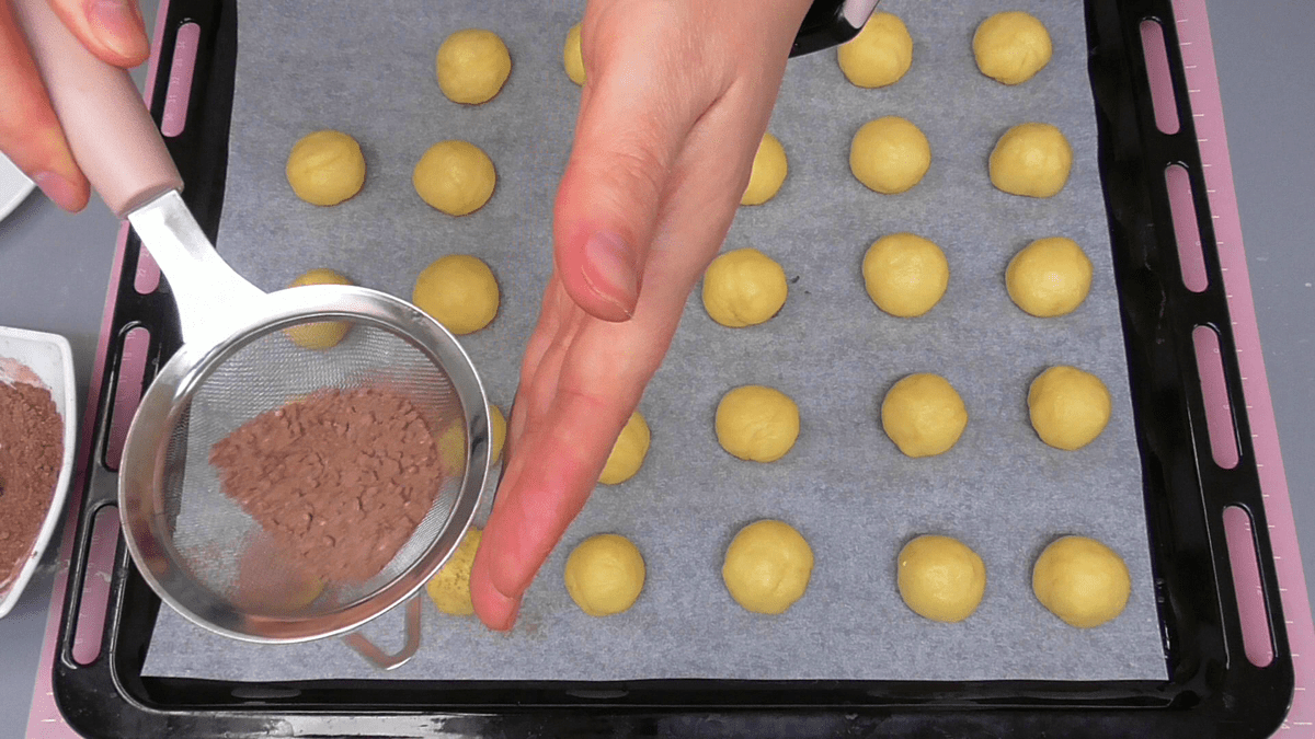 Потім я роблю присипку, змішавши какао з цукровою пудрою, але це необов’язково. Можна нічим не присипати печиво перед випічкою, а присипати цукровою пудрою вже готові.