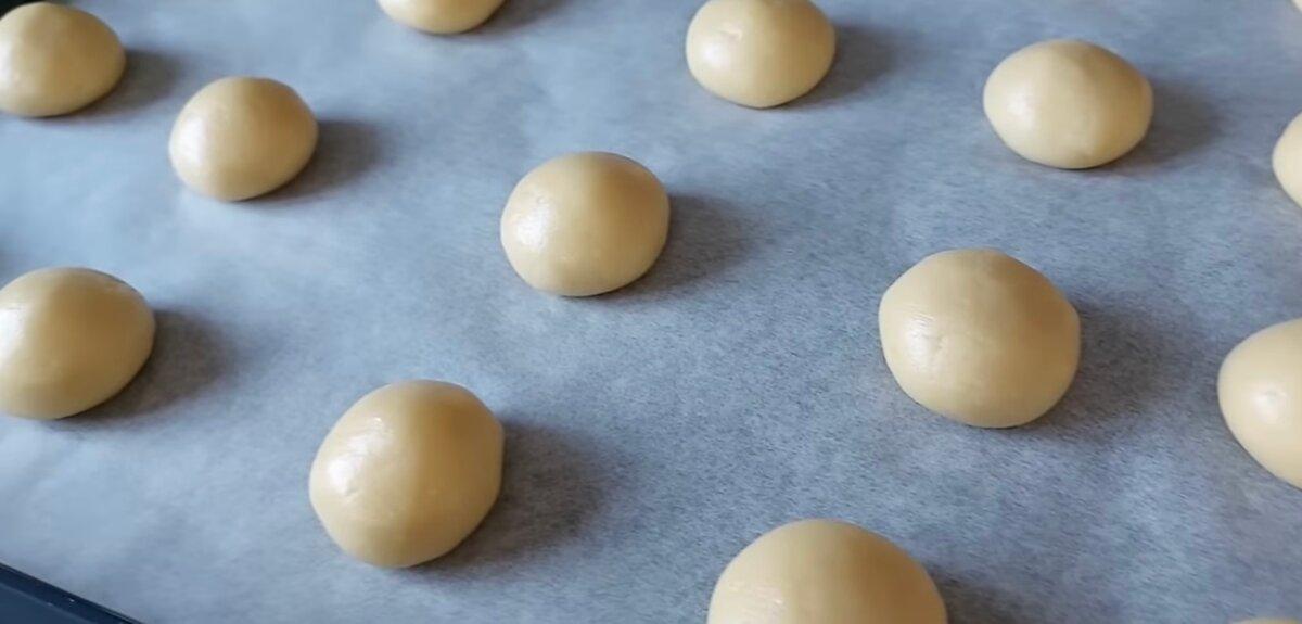 Формуємо невеликих розмірів колобки і перекладаємо на деко з пергаментним папером. Випікаємо п’ятнадцять-двадцять хвилин, при ста вісімдесяти градусах.