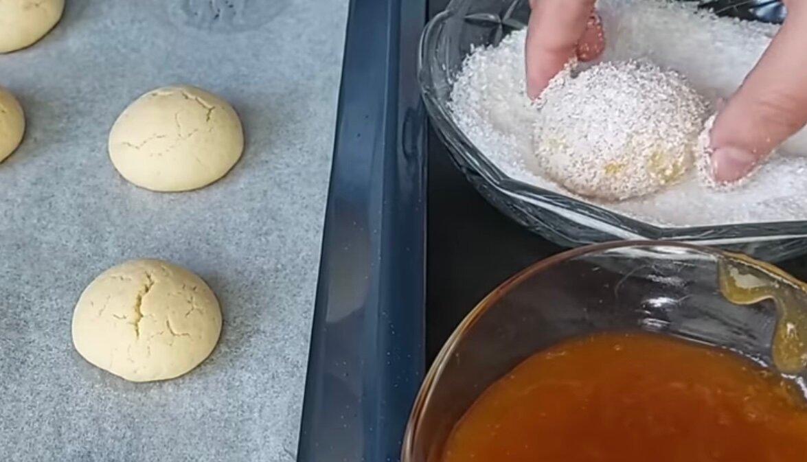 Готове печиво занурюємо у варення, далі в кокосову стружку.
