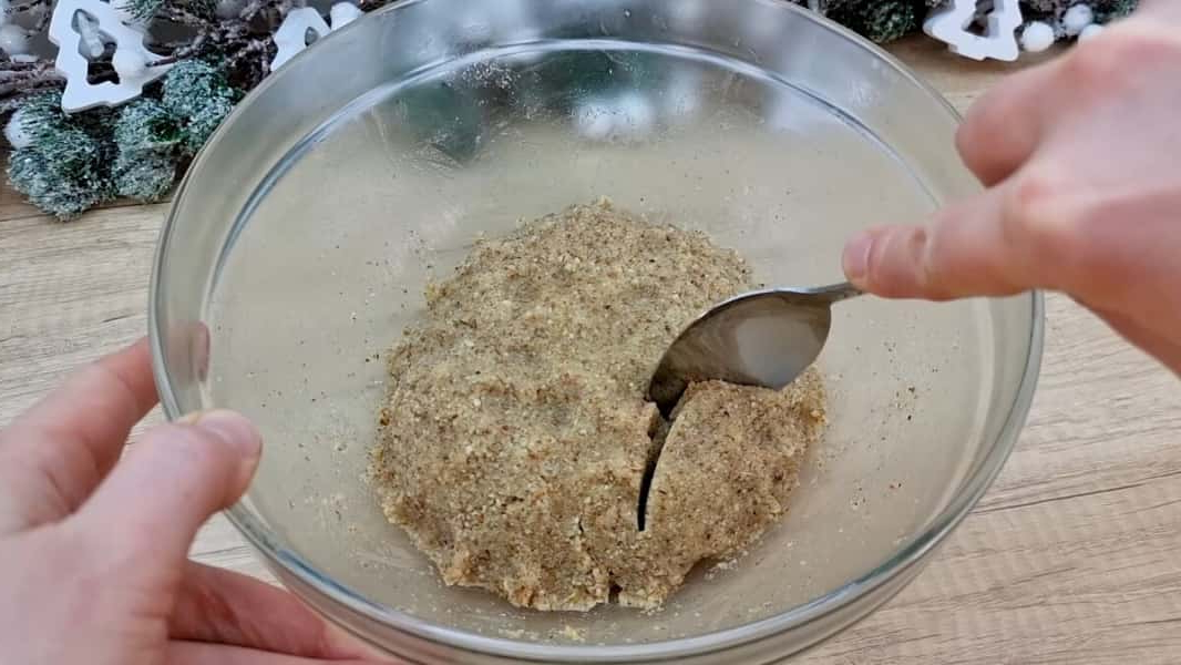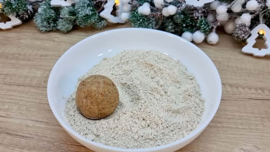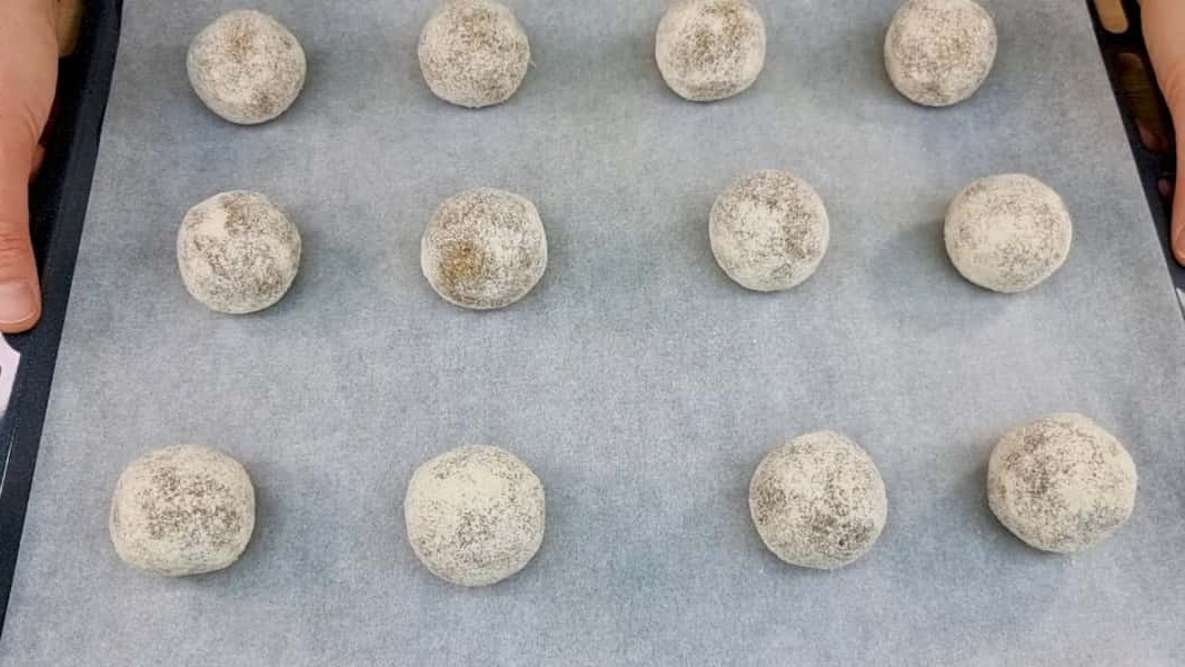 З охолодженого мигдального тіста скачати кульки приблизно з волоський горіх. Обваляти їх у вівсяному борошні та випікати приблизно 15 хвилин при 160*С. Через 15 хвилин дістати лист з духовки і злегка сплескати кожне печиво склянкою. Поставити лист знову в духовку і випікати ще приблизно 10-15 хвилин при тій же температурі