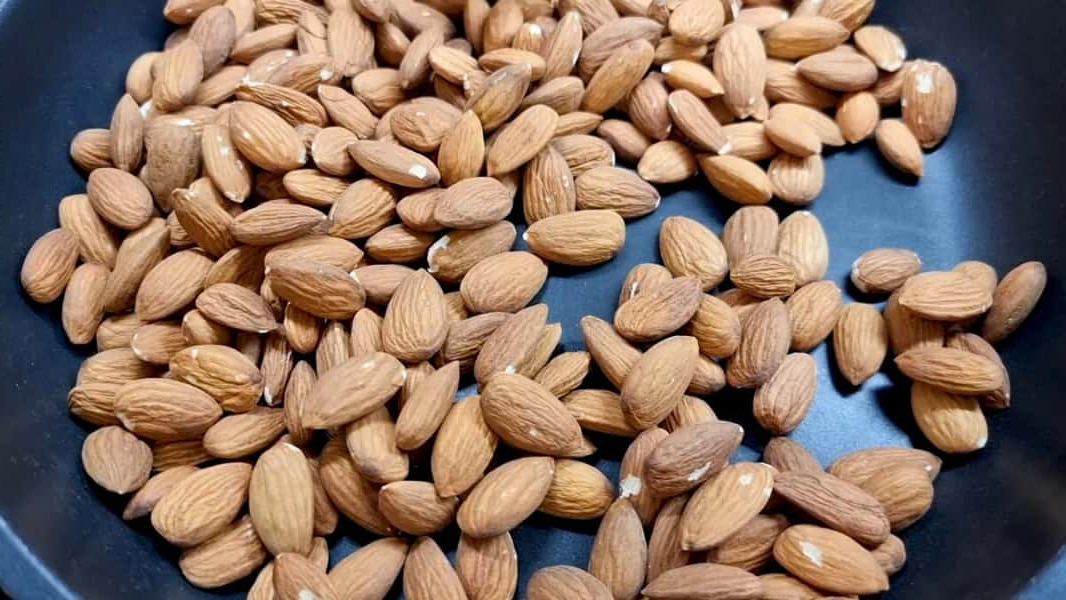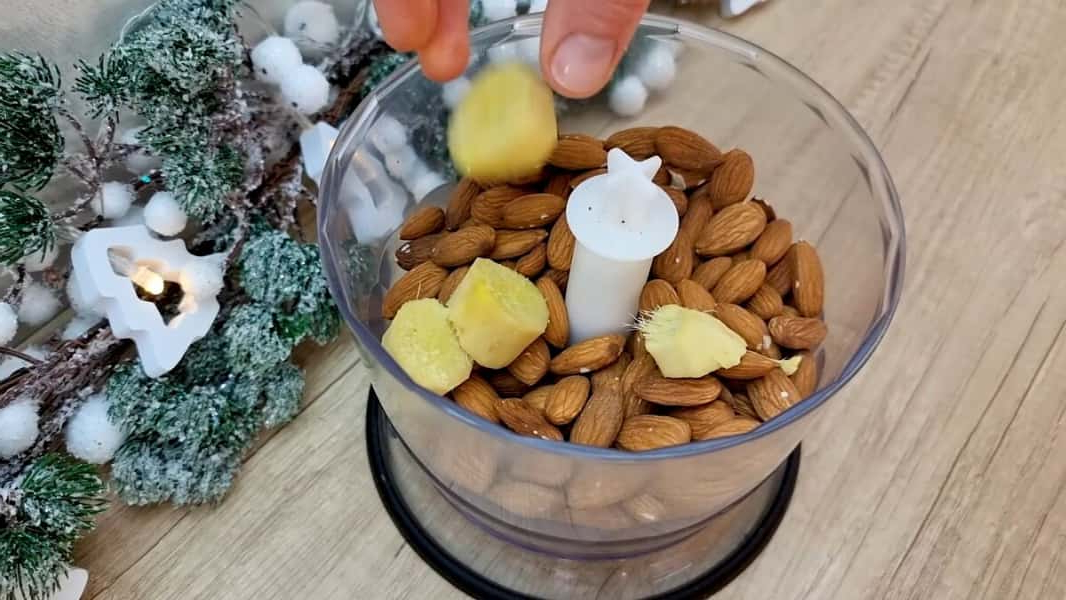Мигдаль трохи обсмажити на сухій сковороді. У блендері з мигдалем можна відразу подрібнити імбир. Подрібнювати до найдрібнішої крихти