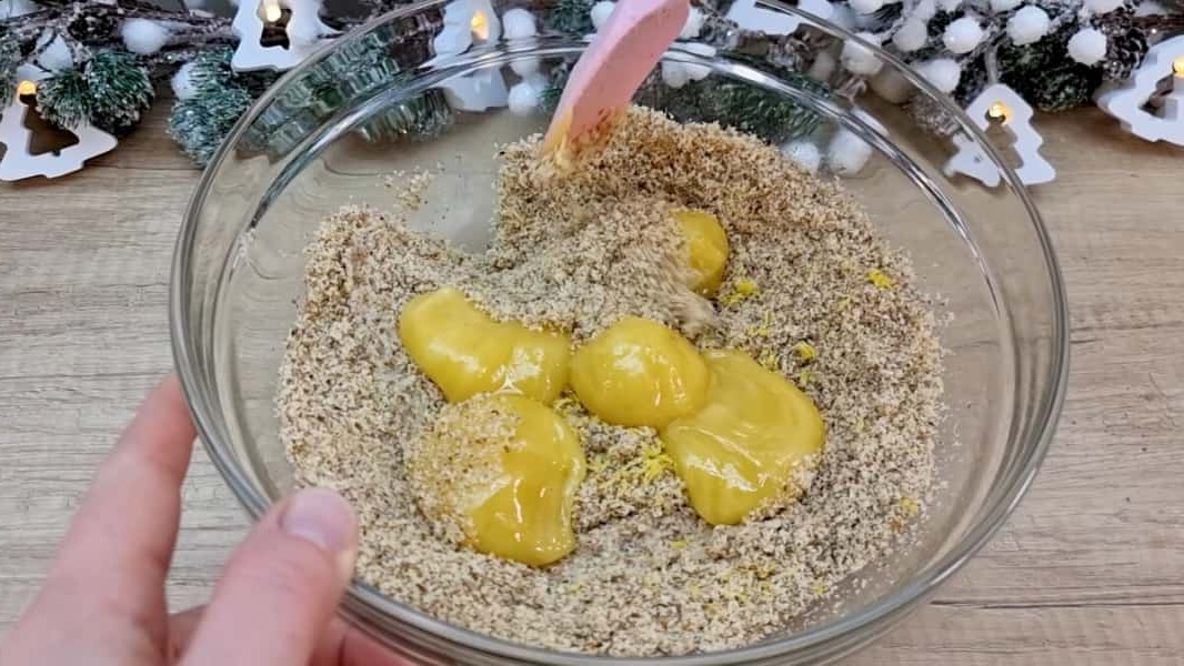 Додати до цих інгредієнтів цедру лимона, лимонний сік та мед. Все ретельно перемішати та замісити тісто. Накрити харчовою плівкою та помістити приблизно на 20 хвилин у холодильник