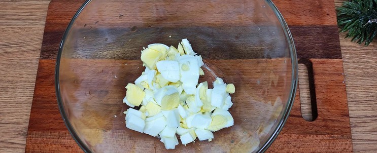 - Яйця відварюємо та нарізаємо дрібними шматочками, подрібнюємо зелень.