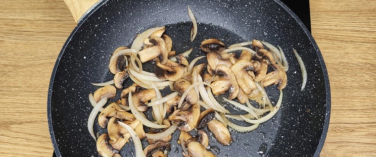 - Ставимо сковороду на плиту, наливаємо олію і обсмажуємо гриби приблизно 7-10 хвилин на повільному вогні, потім додаємо цибулю і трохи обсмажуємо, приблизно 1-2 хвилини, до прозорого стану.