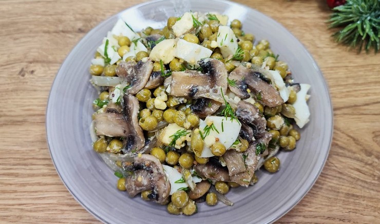 - У мисці змішуємо гриби, яйця і додаємо горошок (попередньо зливаємо рідину), додаємо гірчицю та зелень.