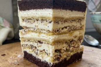 - Після охолодження верхівку обов’язково присипаю цукровою пудрою, як сніг на Карпатах (звідси й назва торта).