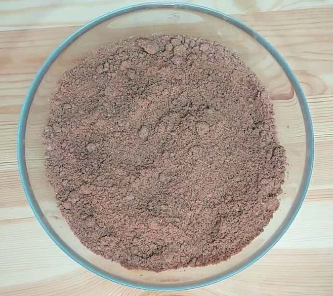 2. У мисці змішати борошно, цукор, какао та сіль. Масло заздалегідь охолодити в морозилці (хвилин 20) та нарізати на дрібні кубики. Руками перетерти суху суміш із маслом в крихту.