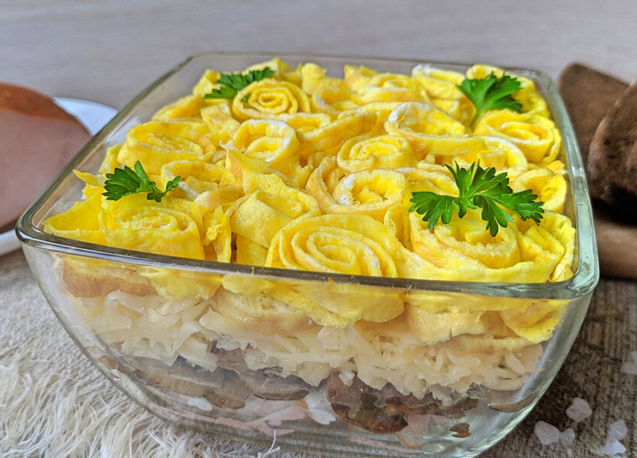 Наступним шаром йдуть варені яйця, протерті через тертку. І знову сіточка з майонезу.