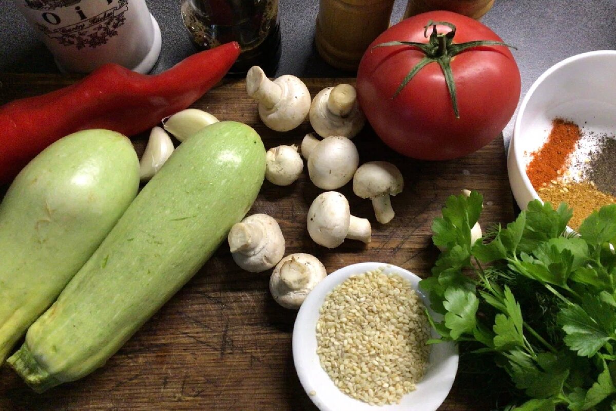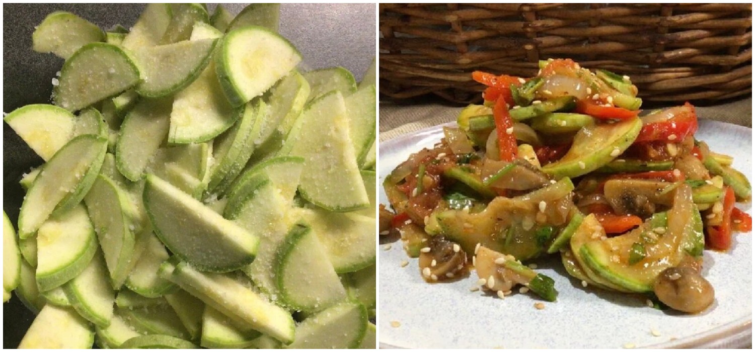Цим часом в глибокій мисці, віджимаємо кабачки. Перекладаємо обсмажені овочі. Обов’язково солимо, перчимо, додаємо свіжий часник, обсмажене кунжутне насіння, 6% оцет, соєвий соус, спеції.