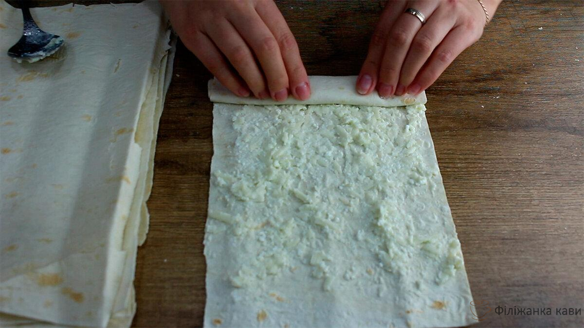 Звертаємо в рулет. Виходить ось така ось трубочка з сирною начинкою. Кладемо поки в сторону і з іншими листами лаваша проробляємо все те ж саме.