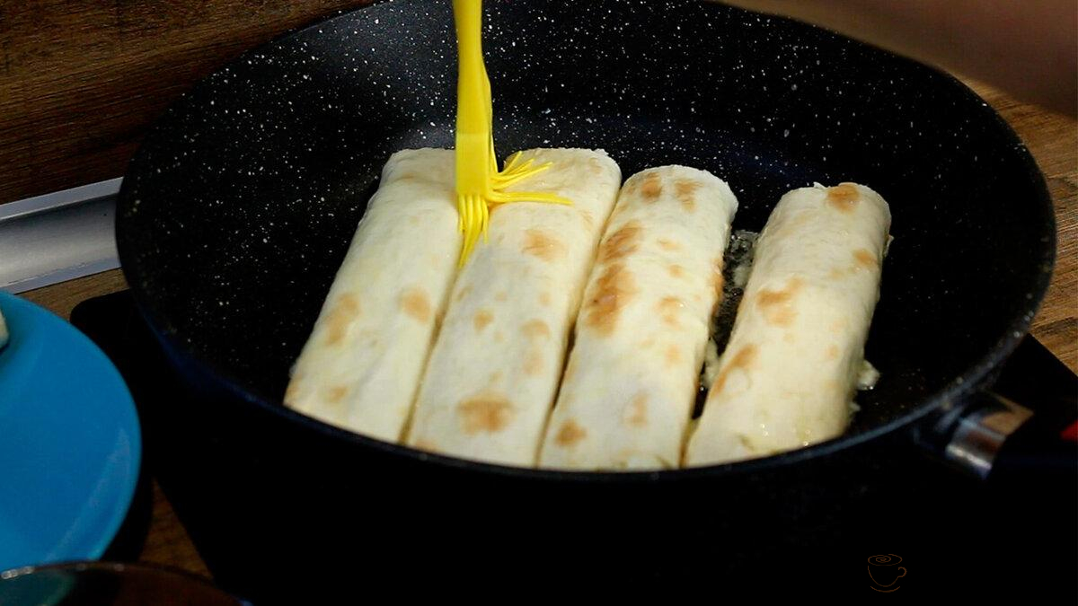 Коли весь лаваш вже на сковороді змащую рясно яйцем зверху. Обсмажуємо на середньому вогні до золотистого кольору. Перевертаємо і смажимо з іншого боку.