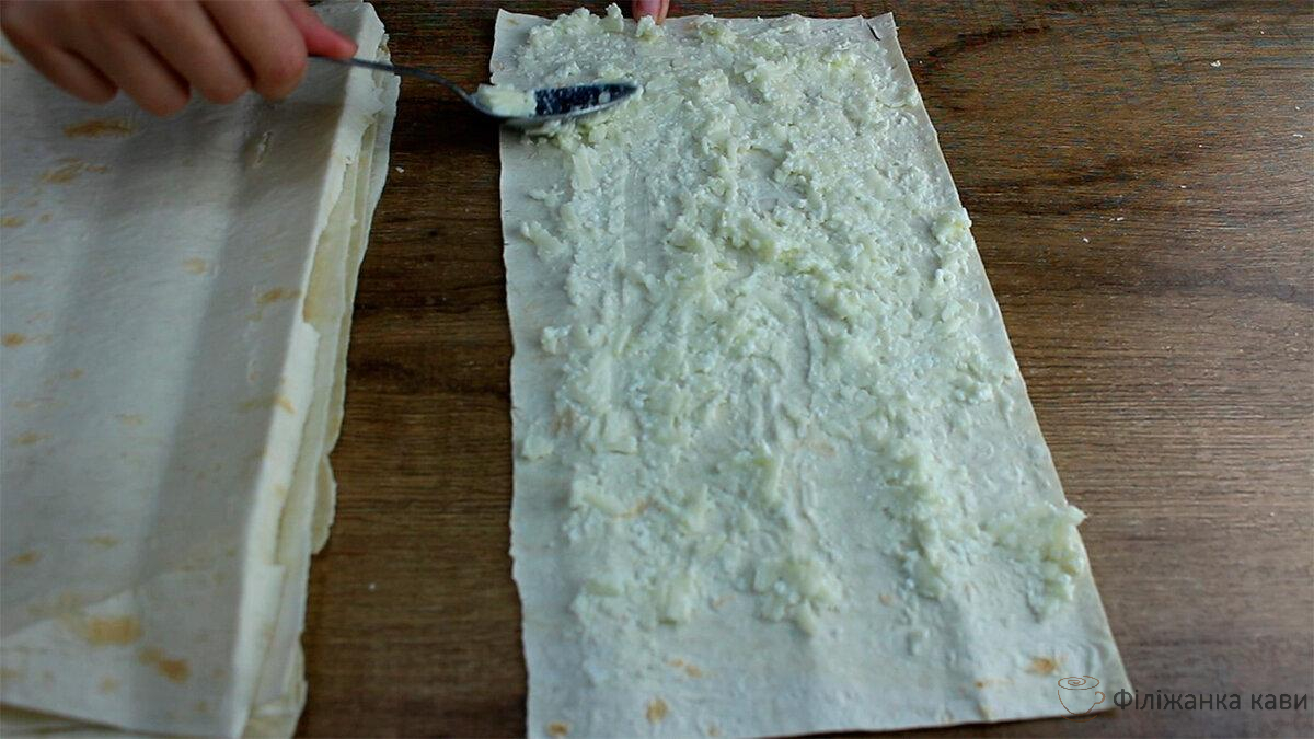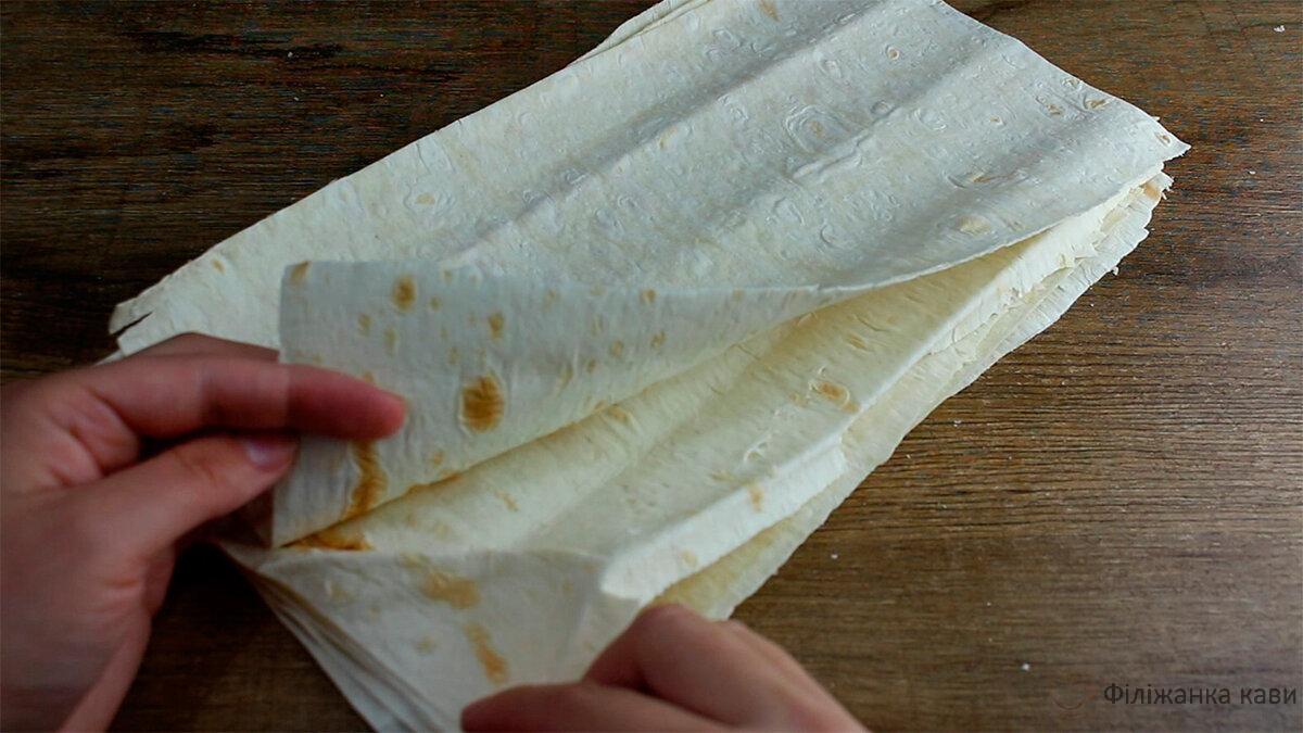 Тонкий лаваш складаємо в 3 рази і нарізаємо на прямокутники. Має вийти 6 або 8 ось таких широких смужок.