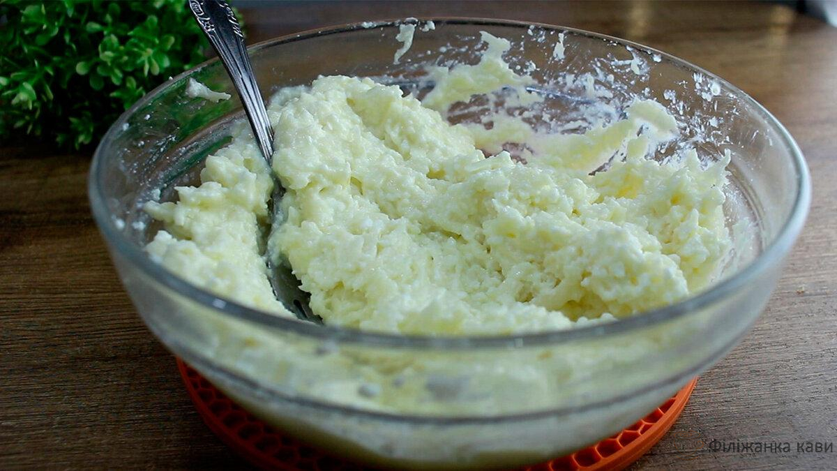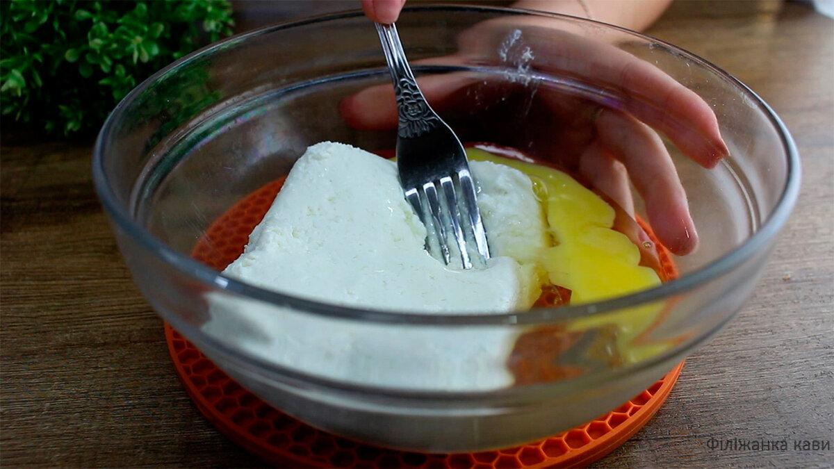 Тепер займемося начинкою. У миску кладемо 200 грам сиру, розбиваємо сюди одне яйце і розминаємо виделкою.