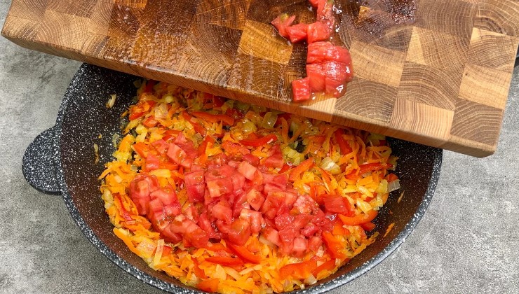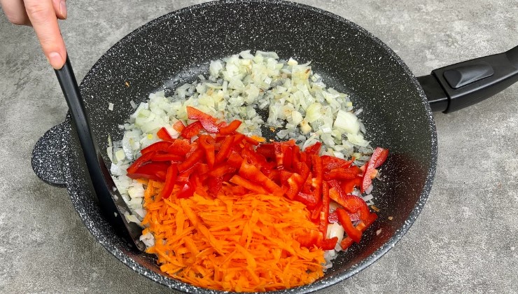 Цибулю дрібним кубиком обсмажуємо на олії до золотистості, потім додаємо терту моркву, болгарський перець соломкою і смажимо все разом ще 3-4 хвилини.
