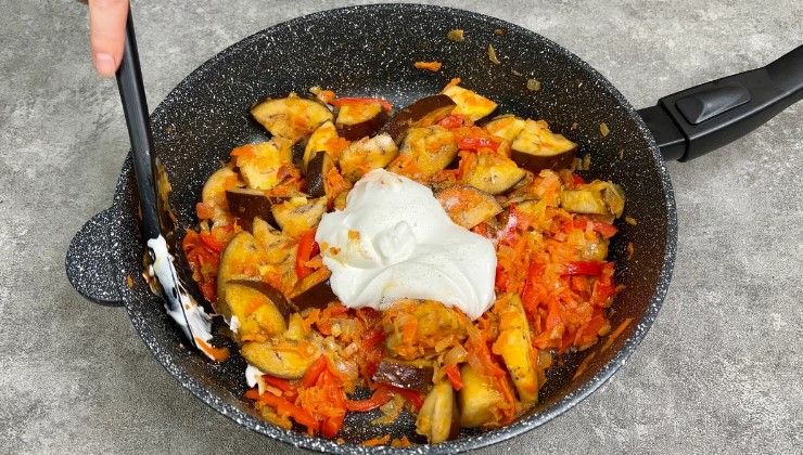 Відправляємо в засмажку нарізані баклажани, смажимо ще 3-4 хвилини, потім додаємо сметану, солимо, прогріваємо 1 хвилину і прибираємо з вогню. Якщо є сумніви щодо гіркоти в баклажанах, замочіть їх попередньо в кип’ятку хвилин на 5-10.
