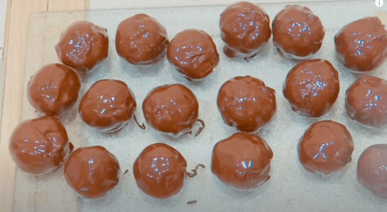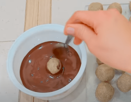 Обмакуємо кожну кульку в шоколад з усіх боків.