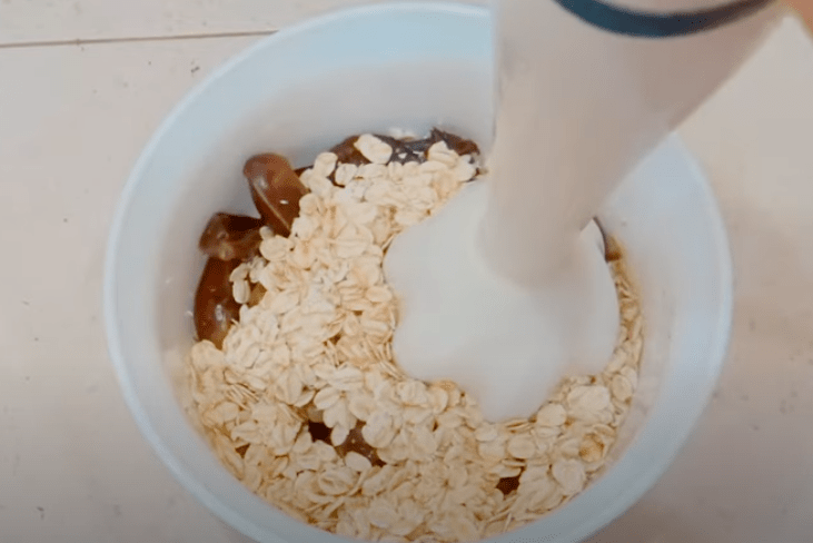 Проціджені від гарячої води сухофрукти змішуємо з вівсяними пластівцями і перебиваємо все блендером в однорідну масу.