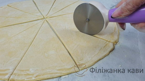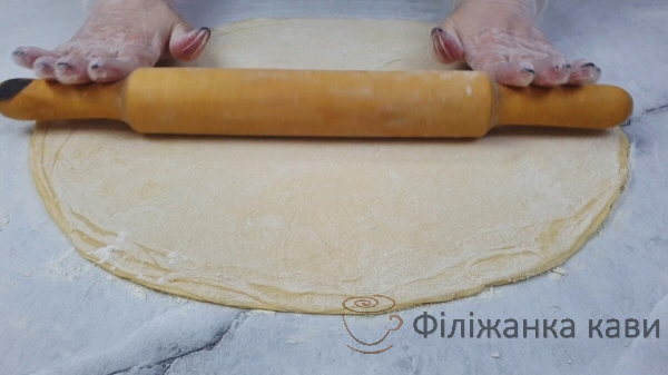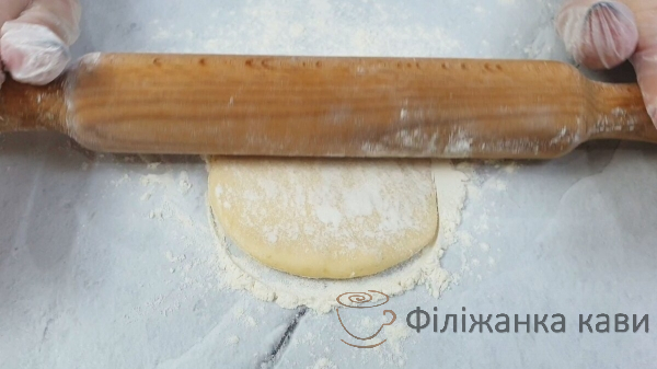 Потім присипаємо стіл і тісто борошном і з кожної кульки розкочуємо коло діаметром 12 см.