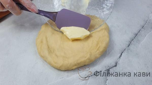 Потім в тісто додаємо шматочок розм’якшеного вершкового масла.